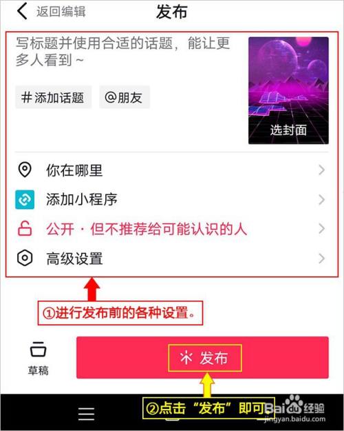 发布视频。进行发布前的各种设置,点击“发布”按钮即可。