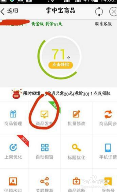 点击该功能以后就能进入到掌中宝商品界面了,这里面有很多功能我们可以使用,因为是要发布商品宝贝,就点击商品发布这个功能,如下图。