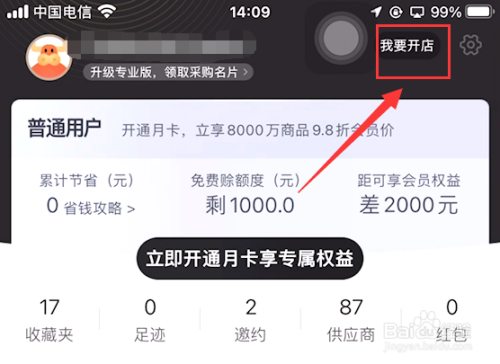 进入【我的】界面以后,然后我们再点击页面右上角的【我要开店】,如下图所示。