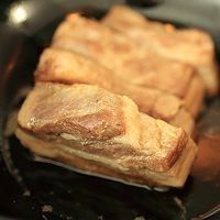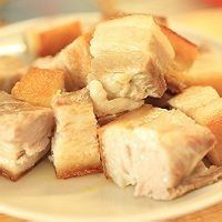 肉皮煎脆即可,捞出晾凉,将五花肉切大块,切时动作要快,肉皮在下面。