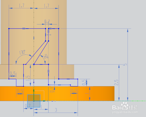 4直接使用拉伸,在拉伸的截面绘制中选用YZ面为草绘面。在草绘中绘出如图所示的截面线。完成后对称拉伸,厚度为0.2.