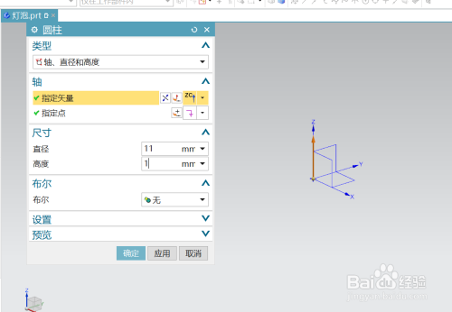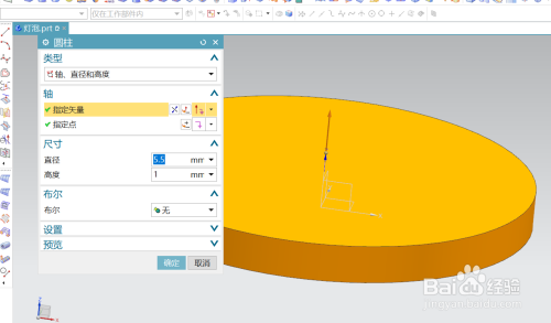 1灯泡部分的结构基本由圆柱体构成。先创建出与灯泡焊接在一起的电路板部分。直接在建模区中选用圆柱,参数如图所示。