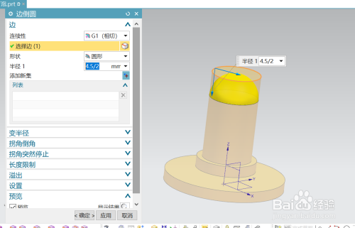 3在台阶上添加凸台,参数如图所示;将凸台顶端的边倒圆角,半径为2.15.得到发光二极管的外部。