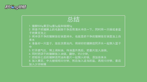 1食材展示:猪脚500克、黄豆5克、姜5克、盐和味精各5克、花生油20毫升。