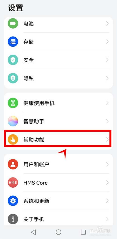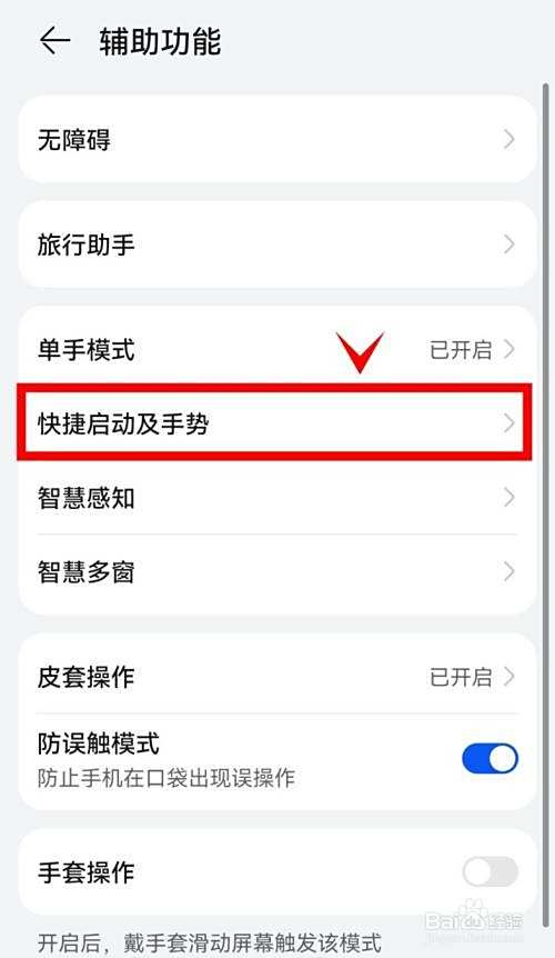 在【辅助功能】界面——选中【快捷启动及手势】选项