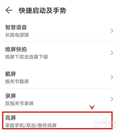 在【快捷启动及手势】界面——点开【亮屏】选项