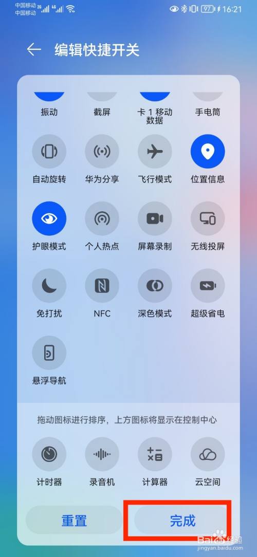在打开的编辑快捷开关页面,完成快捷开关设置后,点击【完成】操作即可。