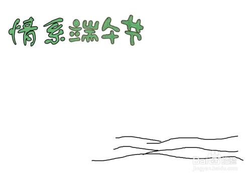 首先用彩色画笔写出情系端午节这个大标题,在标题的下方偏右的位置画上翻滚的波浪,这是第一步的绘制