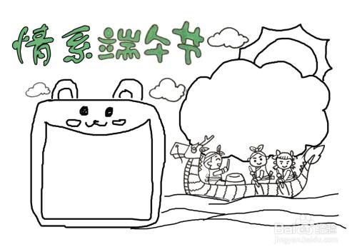 首先写情系端午节的标题,然后在标题下方画上赛龙舟画面,再画云朵形状的边框,左边画圆角矩形边框,最后在边框内画上线格书写文字内容,就可以了