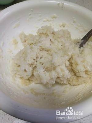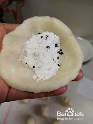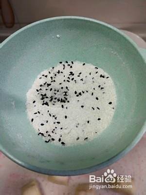 面团晾凉的空,准备内陷。面粉内加入白糖,黑芝麻搅拌均匀