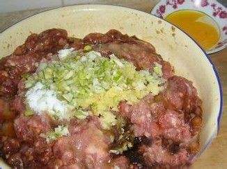 牛肉要去净筋膜、洗净,绞成细末,用嫩肉粉、料酒、精炼油拌匀之后,放置约40分钟,再加姜汁和清水250克进行搅拌均匀;