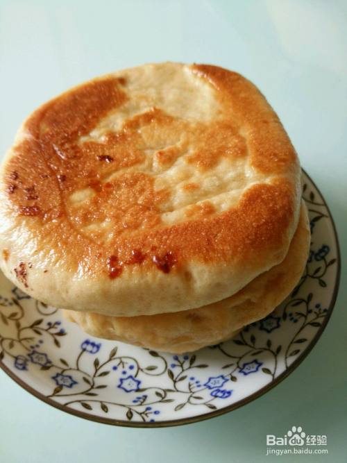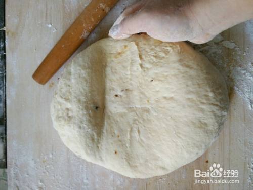将面团用擀面杖推平整再卷起来成一个条。分割成一个一个小面团。按成圆圆的饼状。再次醒发15分钟。