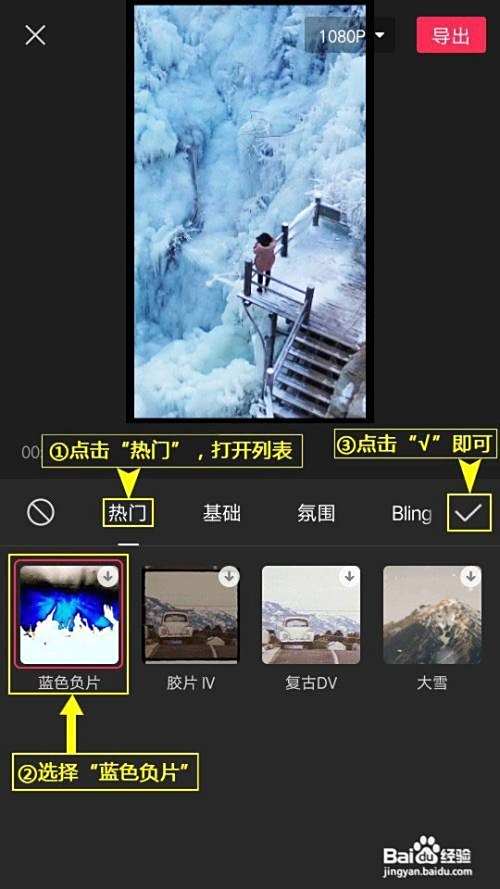 选择特效。点击“热门”,打开列表,选择“蓝色负片”,点击列表右上角的“√”即可。