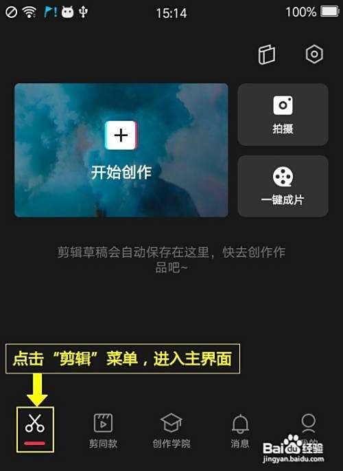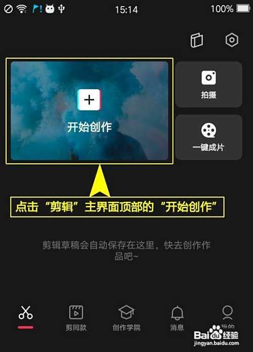 开始剪辑。在剪辑主界面顶部,点击“开始创作”。