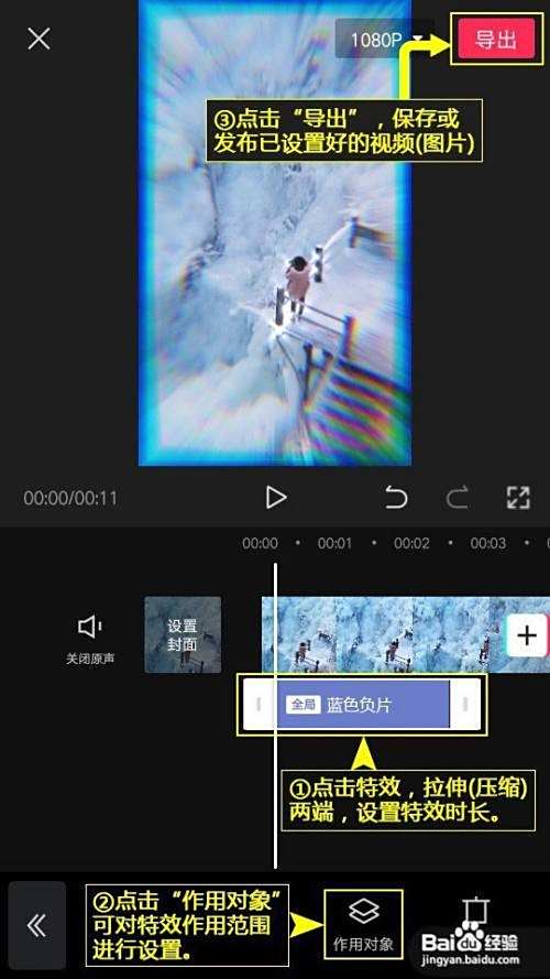 设置特效。点击特效,拉伸(压缩)两端,设置特效时长;点击“作用对象”,可对特效作用范围进行设置;点击“导出”,保存或发布已设置好的视频(图片)。