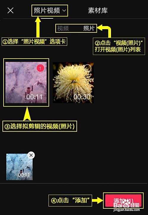 添加视频。选择“照片视频”选项卡,点击“视频(照片)”,打开视频(照片)列表,选择拟剪辑的视频(照片),点击“添加”。