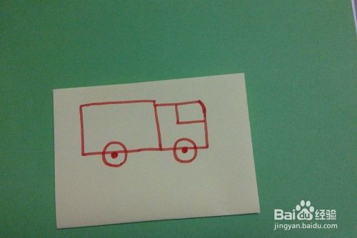 给汽车画出车轮,在画一个方向盘,还有车灯。