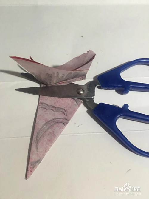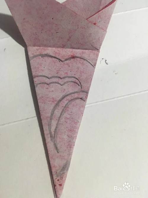 第六步 画完图形之后 再用绘图铅笔并且需要剪掉的地方涂实一下 用手工剪刀剪去上头折痕以外多余的彩纸