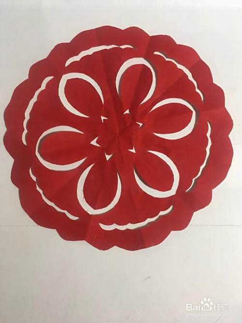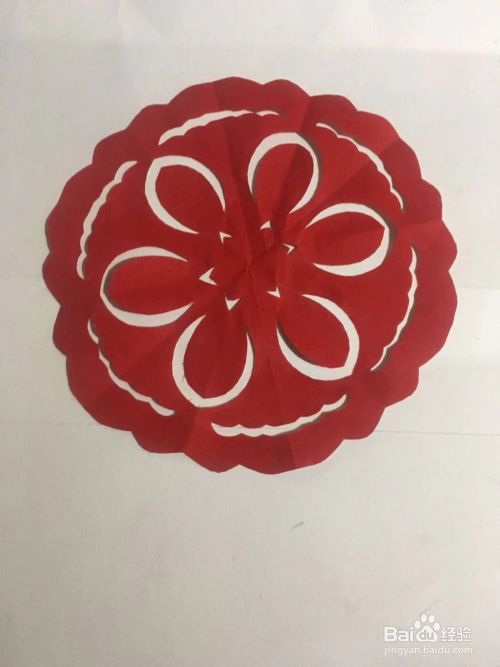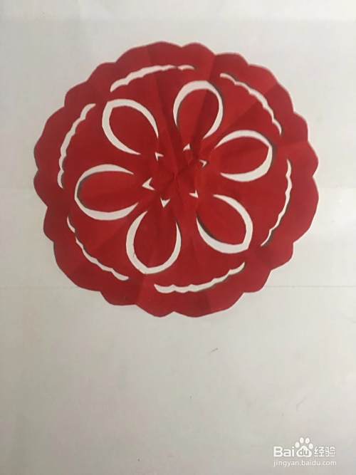 第七步 剪完多余的彩纸之后 再剪里面的花瓣部分和其它涂实的地方 还有它连接的地方 都剪完之后 取开铺平 一副漂亮的延边六瓣窗花就剪好了