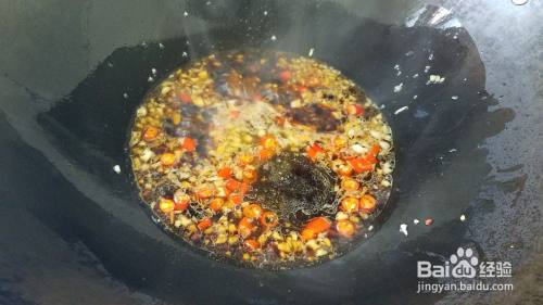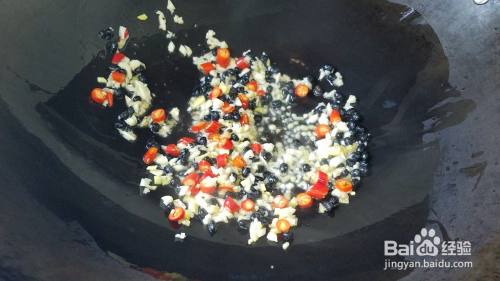 锅里留下一点底油,把准备好的豆豉、大蒜、生姜、辣椒倒进去翻炒,开小火炒出香味,接着倒入一碗清水,然后来调一下味。