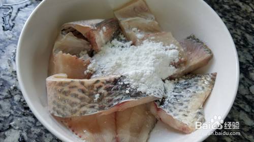 鱼肉沥干水分之后,装入盘中,加入适量的生粉,把鱼肉搅拌均匀,让鱼肉充分的沾上生粉。