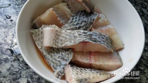 把罗非鱼清理干净,然后倒入2勺料酒,把它搅拌均匀腌制10分钟去腥,也可以用其他的鱼类来代替。