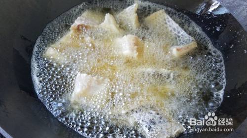 锅里倒多一点食用油,烧到6成热的时候,把沾上生粉的鱼肉放入锅里炸,开中小火把鱼肉炸香。