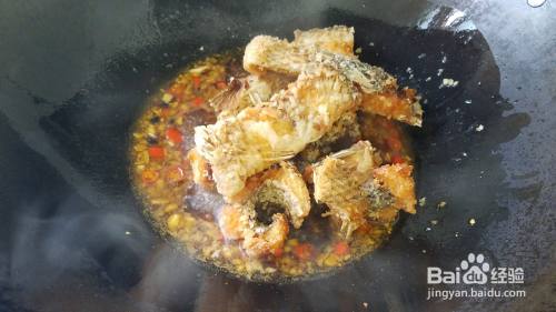 烧开后,把炸好的鱼块倒进去,开小火翻炒一下。