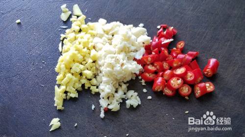 把准备好的生姜、大蒜、辣椒全都切碎备用,不喜欢吃辣椒的可以不放。鱼肉腌制好了之后,把鱼肉沥干水分。