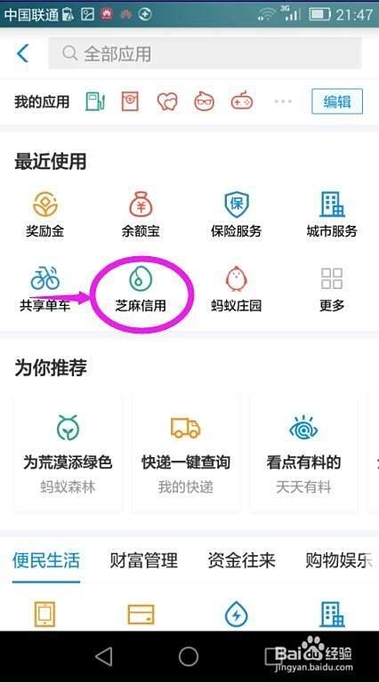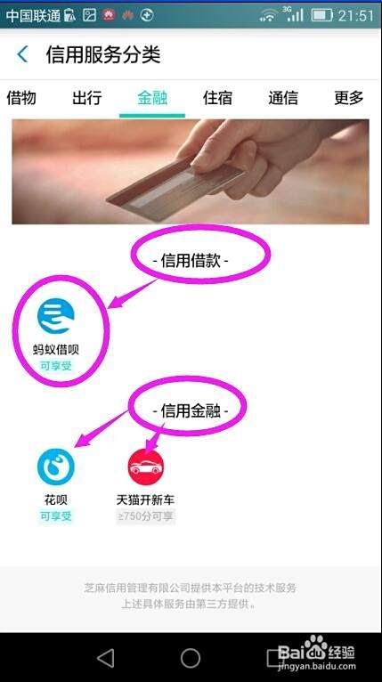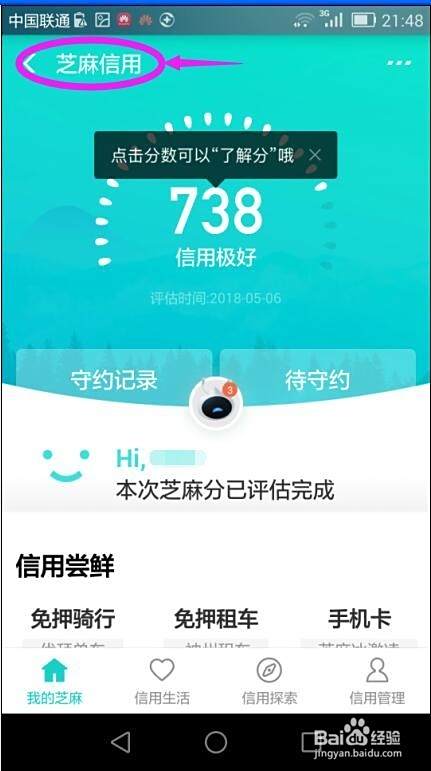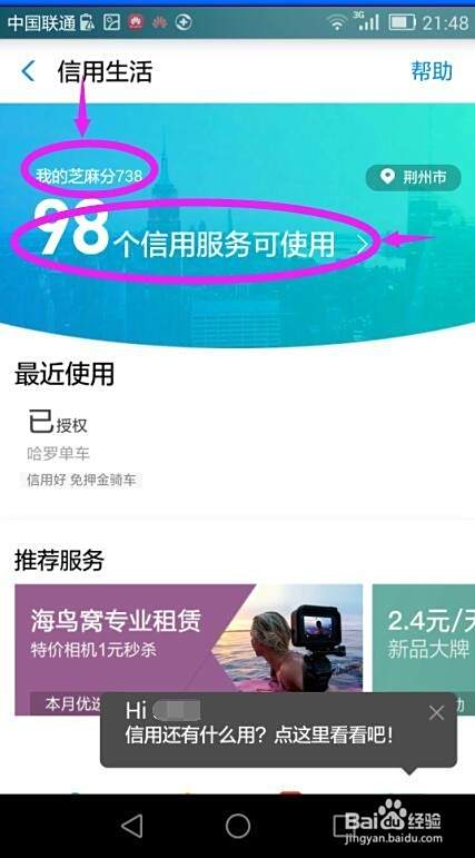可以查看到自己的芝麻信用分,点击98个信用服务可使用这里;