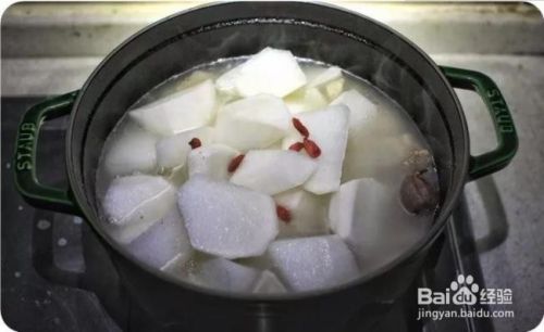 打开锅盖加入白萝卜和枸杞,盖上锅盖继续炖15分钟至萝卜呈透明状,即可关火。