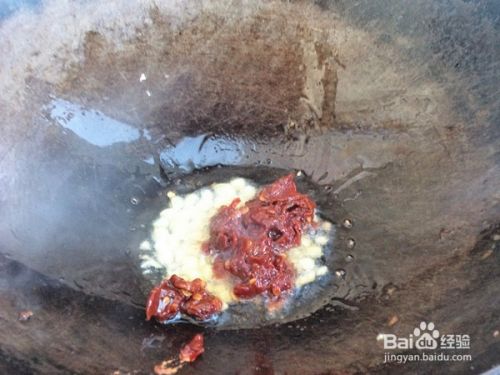 起油锅,姜蒜入锅煸香,豆瓣酱入锅炒。