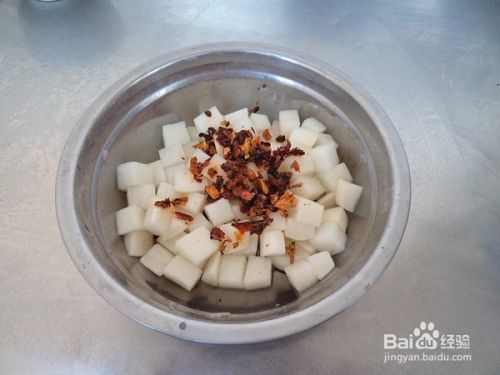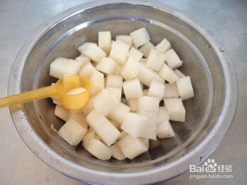 白萝卜切成丁,加盐搅拌均匀腌制10分钟。