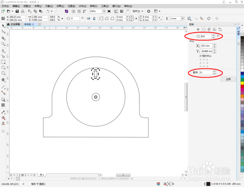 继续点击【椭圆形图案】以中心点为圆心绘制一个小圆图案。点击【矩形工具】按图示绘制一个矩形图案。选中矩形图案,按图示设置好旋转点后,点击【对象】-【变换】-【旋转】,弹出变换设置栏并按图示设置好各个参数,完成矩形的环形阵列操作(如图所示);
