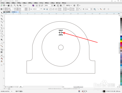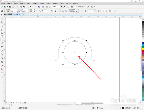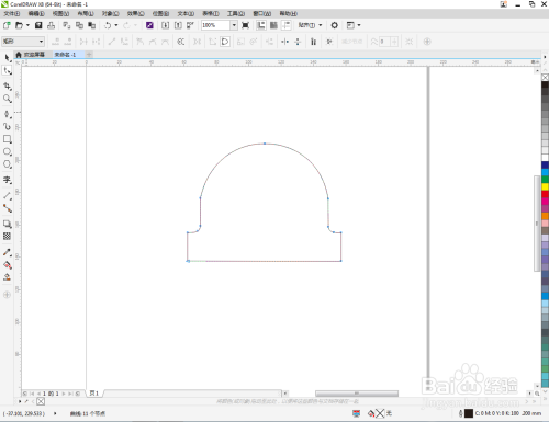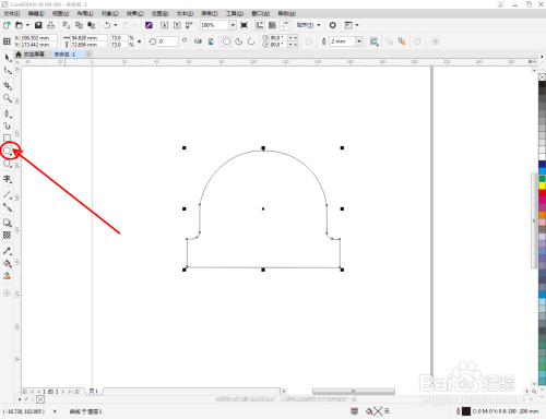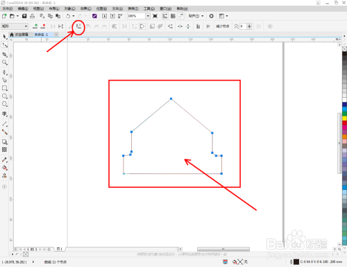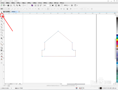 点击【钢笔工具】按图示在作图区域绘制出一个多边图案。点击【形状工具】,框选所有的节点后,点击【转化为曲线】将节点转曲。完成后,选中图示图案上的节点,点击【平滑节点】将节点进行平滑处理并调整好控制点(如图所示);
