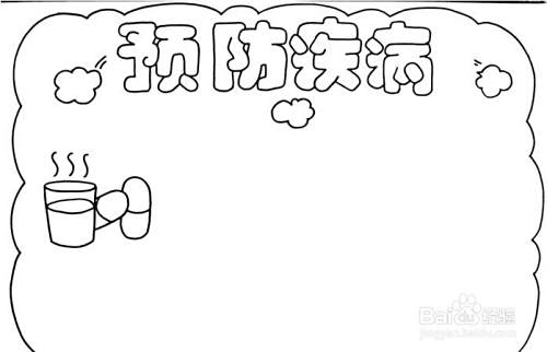 首先在上方画上报头文字,再画出背景边框,文字旁边画上几个气团,再在左边画一杯冒着热气的茶水和两颗药丸。