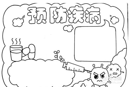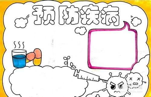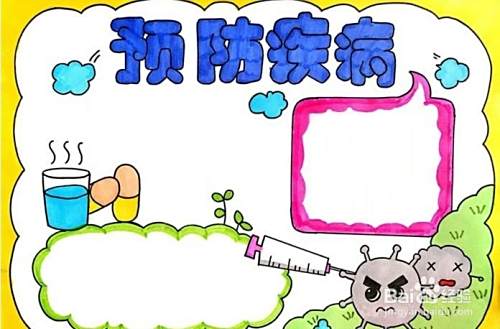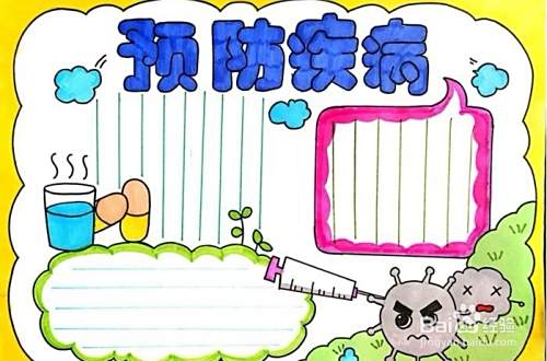 先在上方画上报头文字,再画出背景边框,右下角画上两个病毒和草地,一个注射器正在给病毒打针,空白位置画上两个小边框,画出水杯、药丸和气团作为装饰,涂上鲜艳的颜色,最后画上文字栏,简单的手抄报就画好了。
