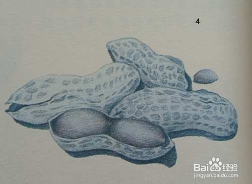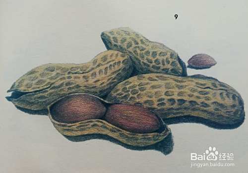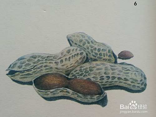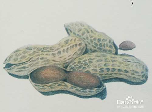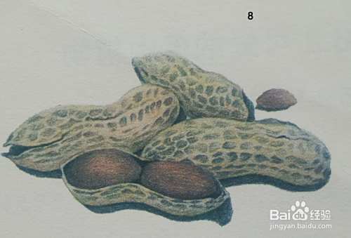 7用深褐色彩铅加深画面的暗部,浅褐色彩铅刻画花生外壳,注意线条要细腻整齐,充分表现出花生的质感。