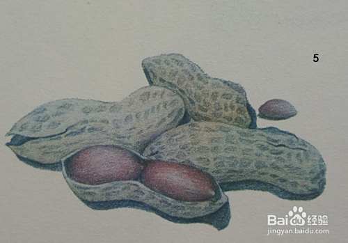 5、用褐色彩铅加深花生壳,浅红色和浅褐色彩铅刻画花生颗粒,使画面色彩完整。