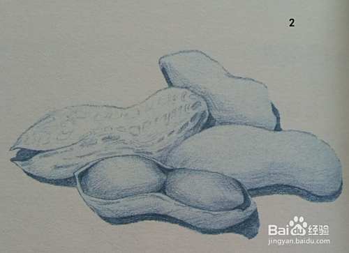 2、用黑色彩铅刻画花生壳的纹理,加重投影和花生的暗面,明确画面素描关系。