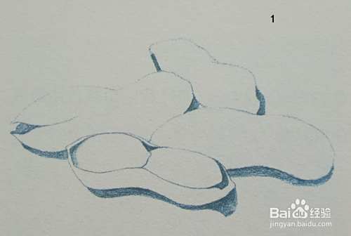 1、用黑色彩铅或者2B铅笔,画出花生的外形及投影。