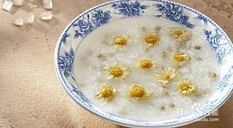 菊花粥:粳米100克煮粥,将熟时,加入菊花粉适量白糖调味食用。有祛风清热,清肝火,降血压的作用。适用于风热目赤,肝火头痛,高血压,冠心病,眩晕,目暗等症。汗多或脾虚便溏者不宜食用。