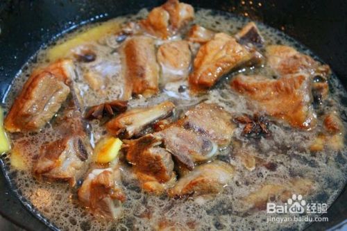5、 加入适量酱油,翻炒匀均。倒入热水。放入盐,八角。大火烧开后转温火炖制一小时左右。