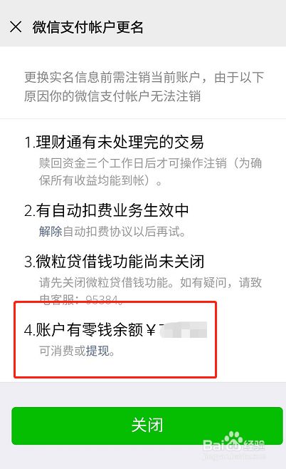 此页最为关键,可以看到账户有零钱余额是没有办法进行更改实名的,必须消费或者提现,所以由此可见,更改实名后,微信的零钱肯定为零,因为实名认证是与微信支付息息相关的。