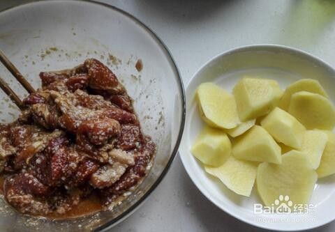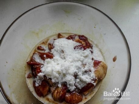腌渍后的肉片两面沾满糯米,平铺在盘子中