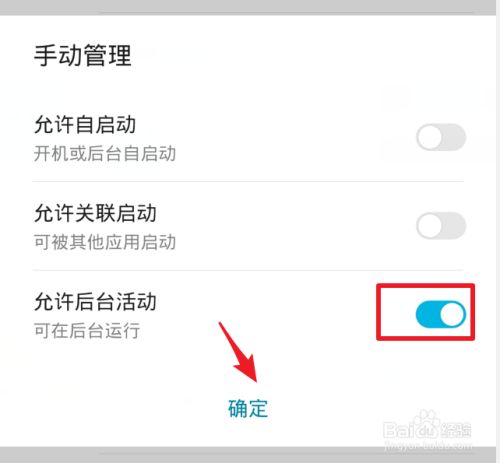切换后,在手动管理设置界面,将“允许后台活动”的开关打开,点击下方的确定。
