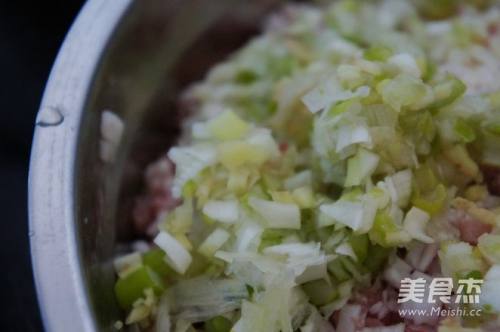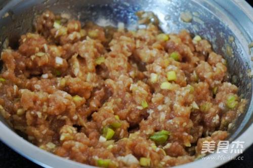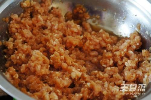 2瘦猪肉馅少加一点老汤沿一个方向搅拌均匀,让肉馅充分吸收老汤的汁液,加入油、酱油、料酒、五香粉、胡椒粉调味