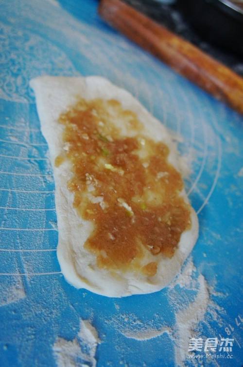 7浆面团做成馒头大小的剂子,擀成饼,抹上猪肉馅,卷起来