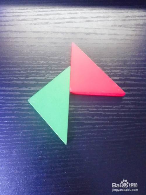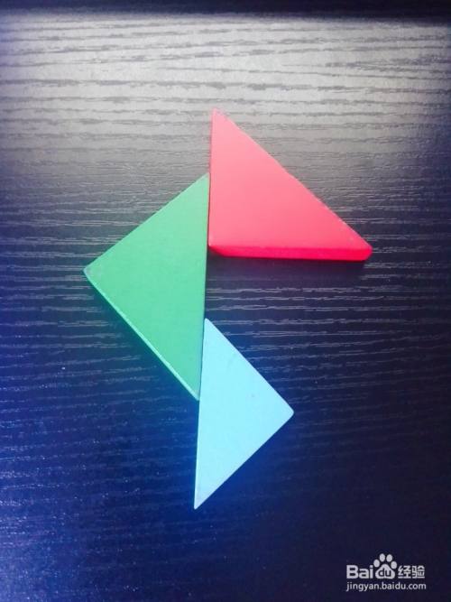 拿出一个绿色大号三角形板放在红色大号三角形板的左边,如图所示。