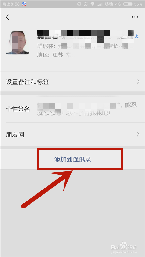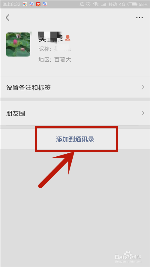 6、系统弹出对方的资料,选择【添加到通讯录】。